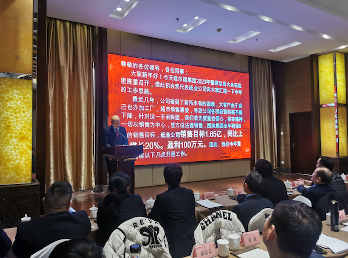 紙業(yè)公司總經(jīng)理朱光明表態(tài)發(fā)言。2023年,紙業(yè)公司銷售目標(biāo)1.65億,同比上年增長20%。