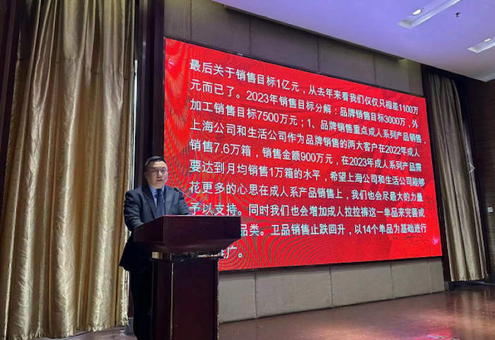 婦幼公司總經(jīng)理胡勇表態(tài)發(fā)言。2023年,婦幼公司銷售目標(biāo)1億元,同比上年增長13%。